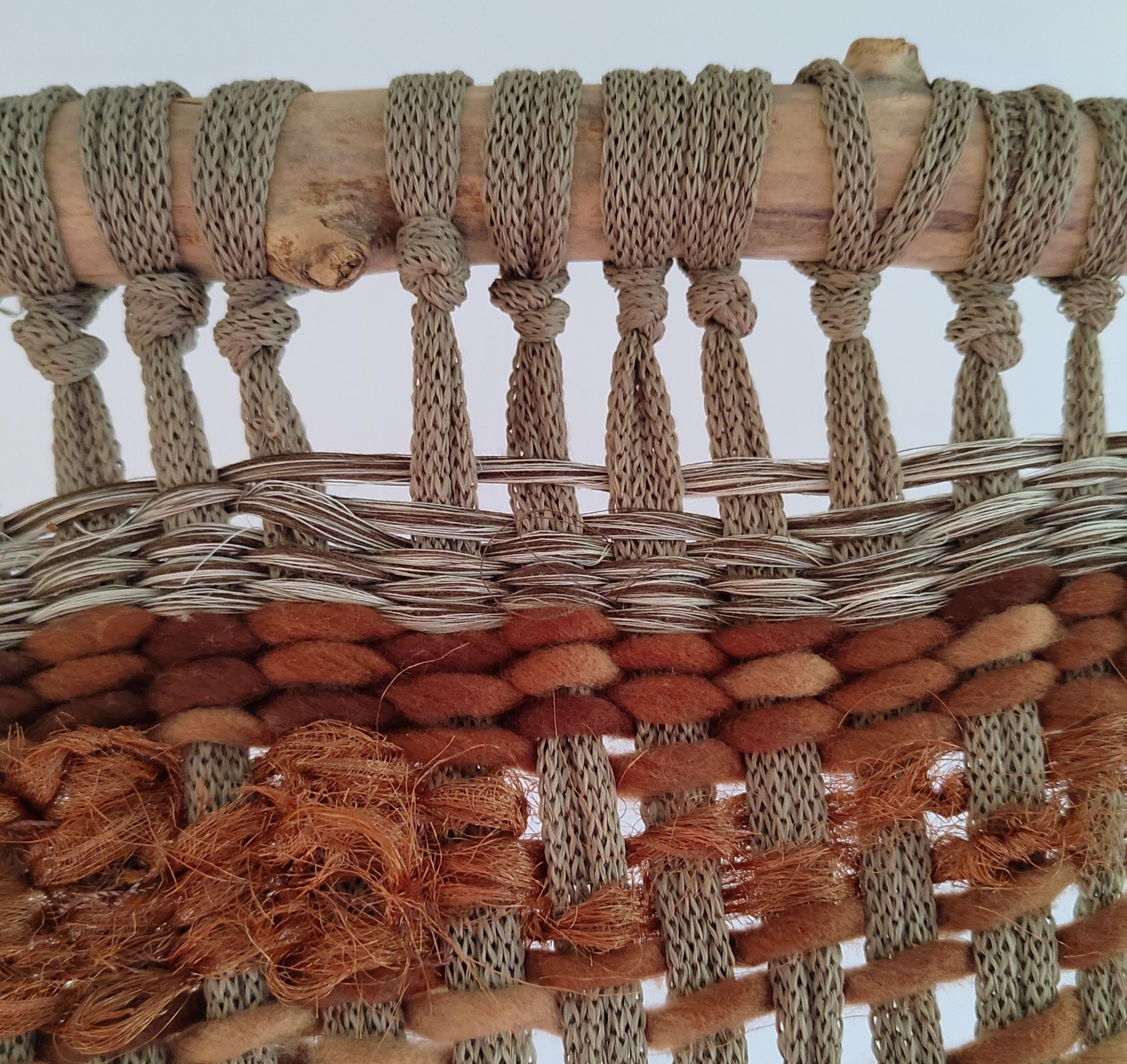 Materiales: lana, rafia, fibras acrílicas, algodón, jute, esparto, piedras, maderas de deriva, cerámica, flecos de un sillón antiguo y cuentas de un ábaco antiguo.
