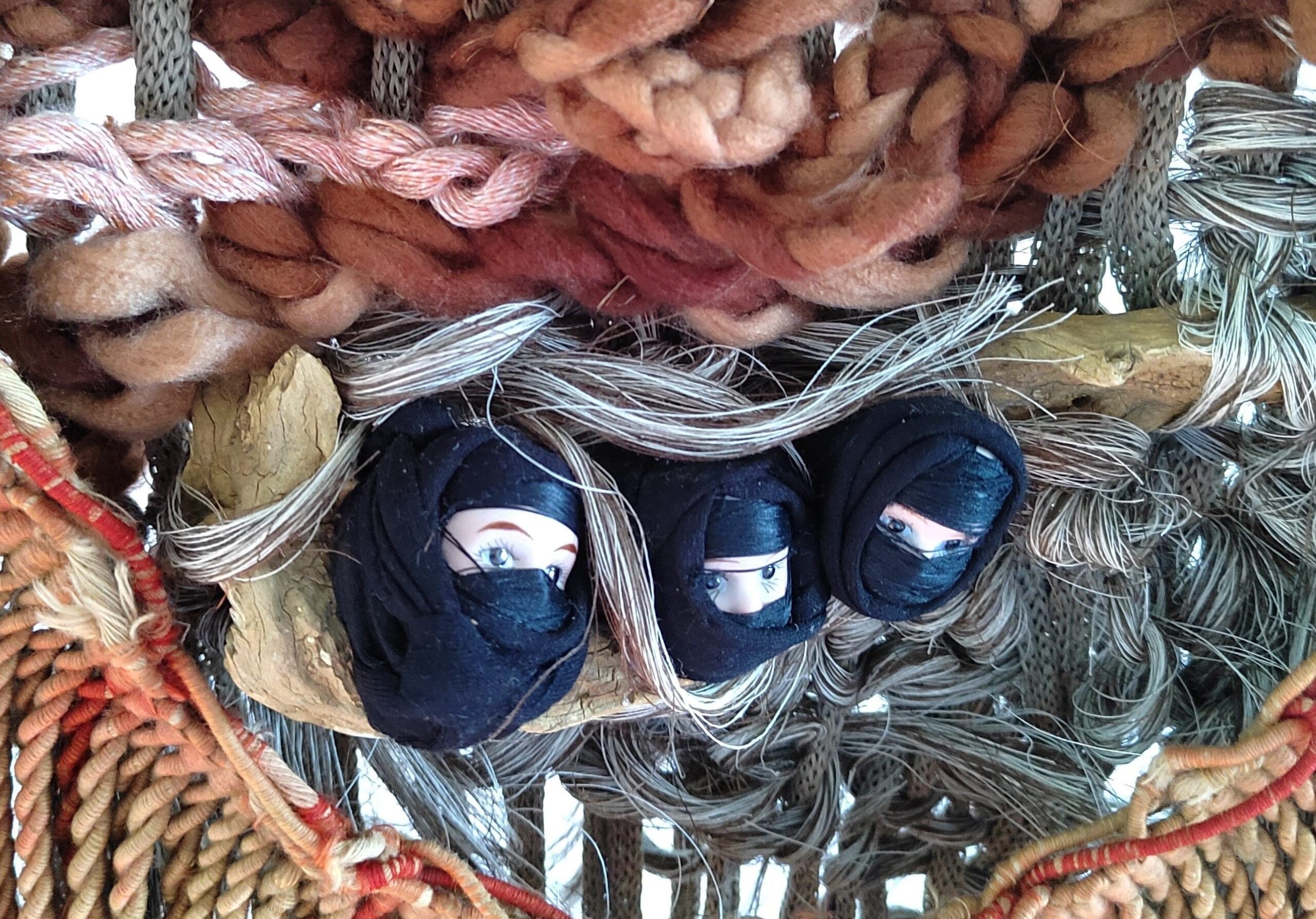 «Esta noticia me hizo reflexionar e inspiró el tapiz “Sin voz, sin vida”. Los colores de las montañas, las dunas, las telas tradicionales, la luz, la tierra, las especies. Se establece un discurso entre diferentes materiales y esas cabezas con las bocas tapadas, quieren alertar del gran retroceso en las libertades de las mujeres».